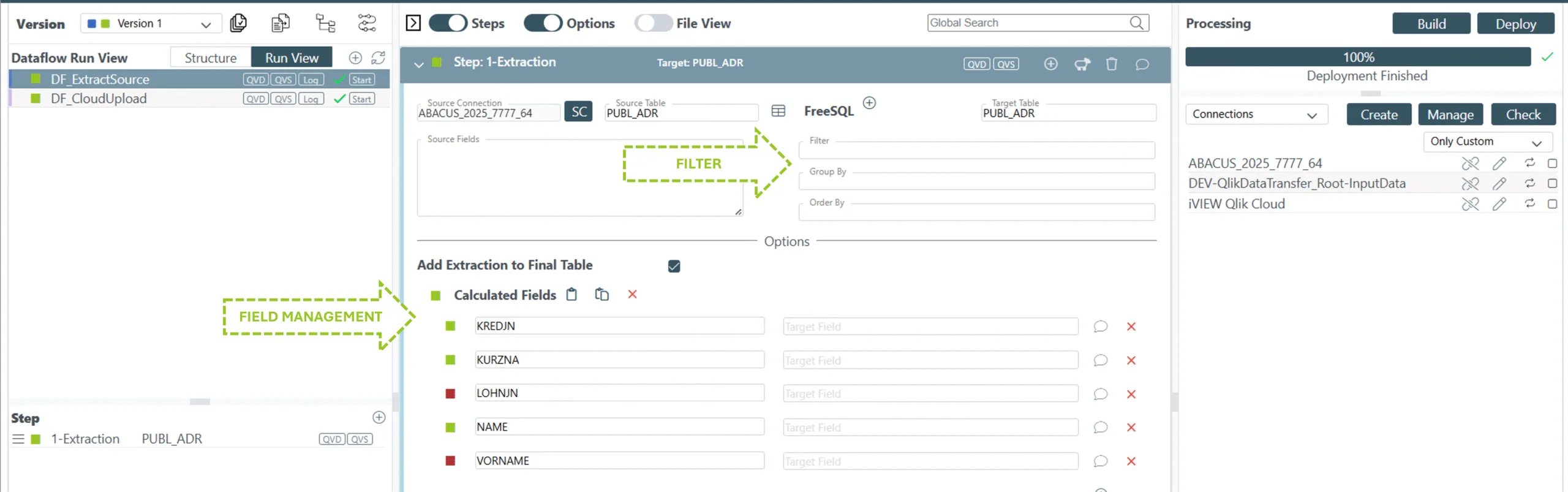 Dataflow can extract data, reduce or transform it before upload. In addition, it provides dedicated functions to filter data and enable or disable fields, ensuring that only the necessary fields and tables are uploaded.